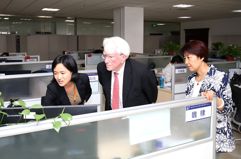 讲座开始前,Goddar教授饶有兴致地了解了审查员办公系统,并参观东丽区专利综合服务平台。(办公室 王芳/供稿,曹瀚之/摄影)