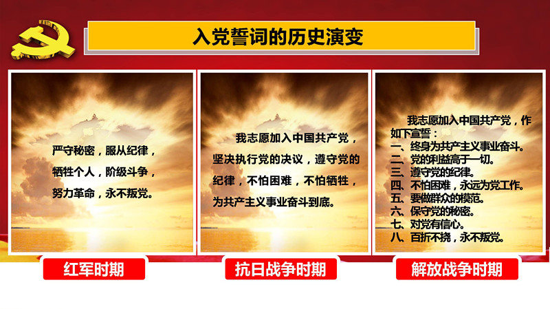 活动中,全体党员共同回顾了入党誓词的历史起源和演变历程,从红军时期、抗日战争时期、解放战争时期、新中国成立初期到党的十二大以后,不同时期的入党誓词反映了时代赋予党员的不同使命。